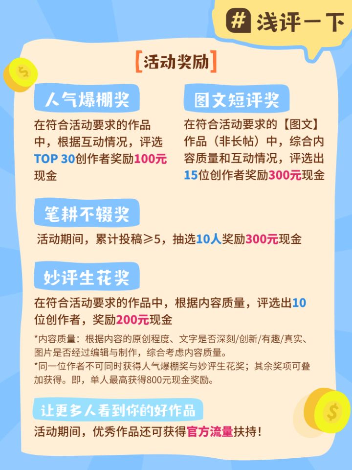 ❣️妙评生花奖:在符合活动要求的作品中,根据内容质量,评选出10位创作者,送出200元现金奖励
