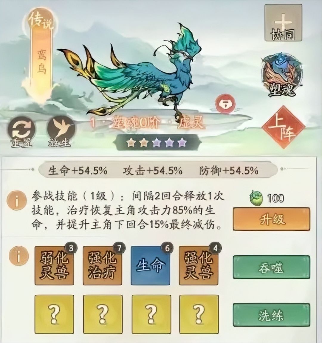 精怪方面,小龙女、大山妖和山泽精是最佳选择。小龙女和大山妖能提供减伤效果,配合鸾鸟的技能减伤加成,能大大提升抗伤害能力。而山泽精则能在关键时刻恢复大量血量,确保生存。