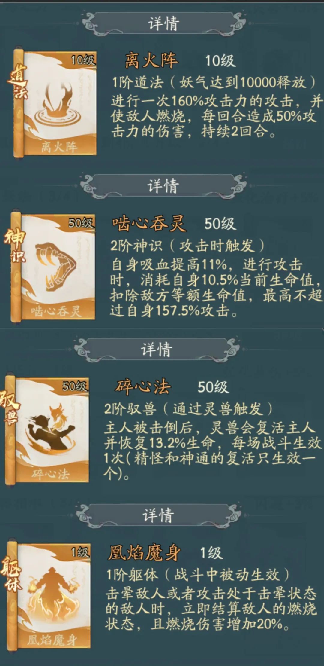 神通选择上,离火阵、啮心吞灵、碎心法和凰焰魔身是核心技能。这套搭配放弃了传统的护体金光和铜皮铁骨,选择了更加激进的离火阵和凰焰魔身,以进攻为主。这种打法不仅效果不逊于传统的玄武吞灵流,而且更适合平民玩家培养。