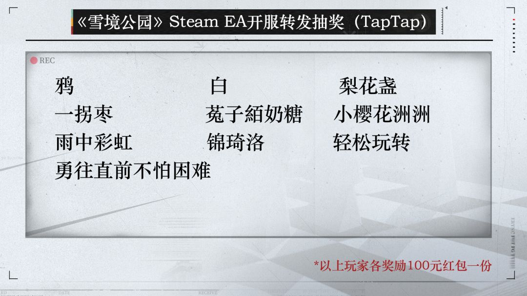 【雪境公园】Steam EA开服转发抽奖获奖名单公示