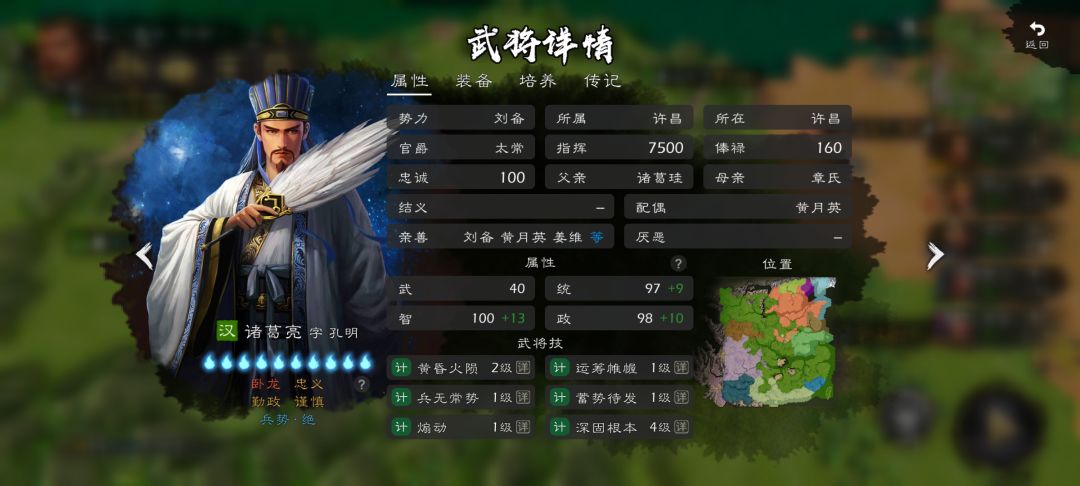 大丞相诸葛亮,在逐鹿里面文官技能链都蛮离谱的,但丞相绝对是最全面的一个,再动+最高单体奶+眩晕昏头崽+范围法术+回蓝。一个人坐镇中军能给你满满的安全感。