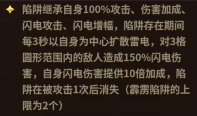 根据描述,造成150%闪电伤害和自身闪电伤害提供10倍加成的意思是,攻击力的150%和闪电伤害的1000%将构成陷阱的基础伤害,即