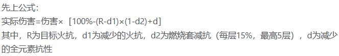 火焰抗性与其他抗性不一致的地方在于,燃烧套的减抗是乘除法而非加减法,所以计算会复杂一点。
