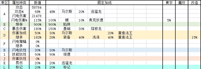 这几个乘区主要是考虑蝮能继承给陷阱的属性收益——攻击力、闪电伤害、伤害加成和闪电增幅,以下是我的属性: