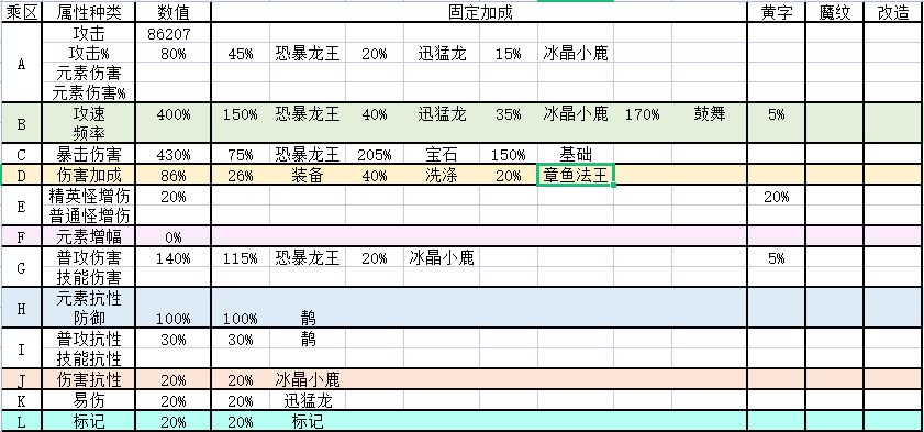这几个乘区主要是考虑装备的黄字或性格的选择——5%攻击力、10%攻速、10%暴击伤害、5%伤害加成、10%精英怪增伤,5%普攻增伤,以下是我的属性: