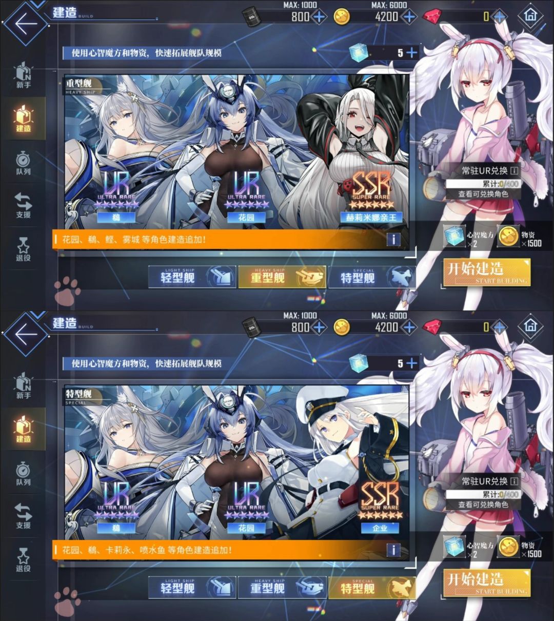 海上传奇角色无论舰种,加入常规建造时,都将同时加入【重型舰】建造池与【特型舰】建造池。