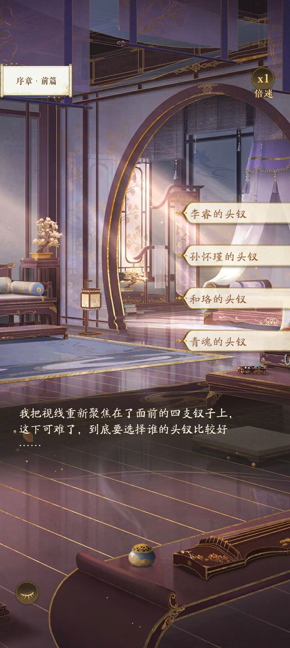 序章前篇:公主们想走哪位名士的支线就选择他的发钗(倾慕值+200,各属性+30),并保持该名士的倾慕值比其他三人高。