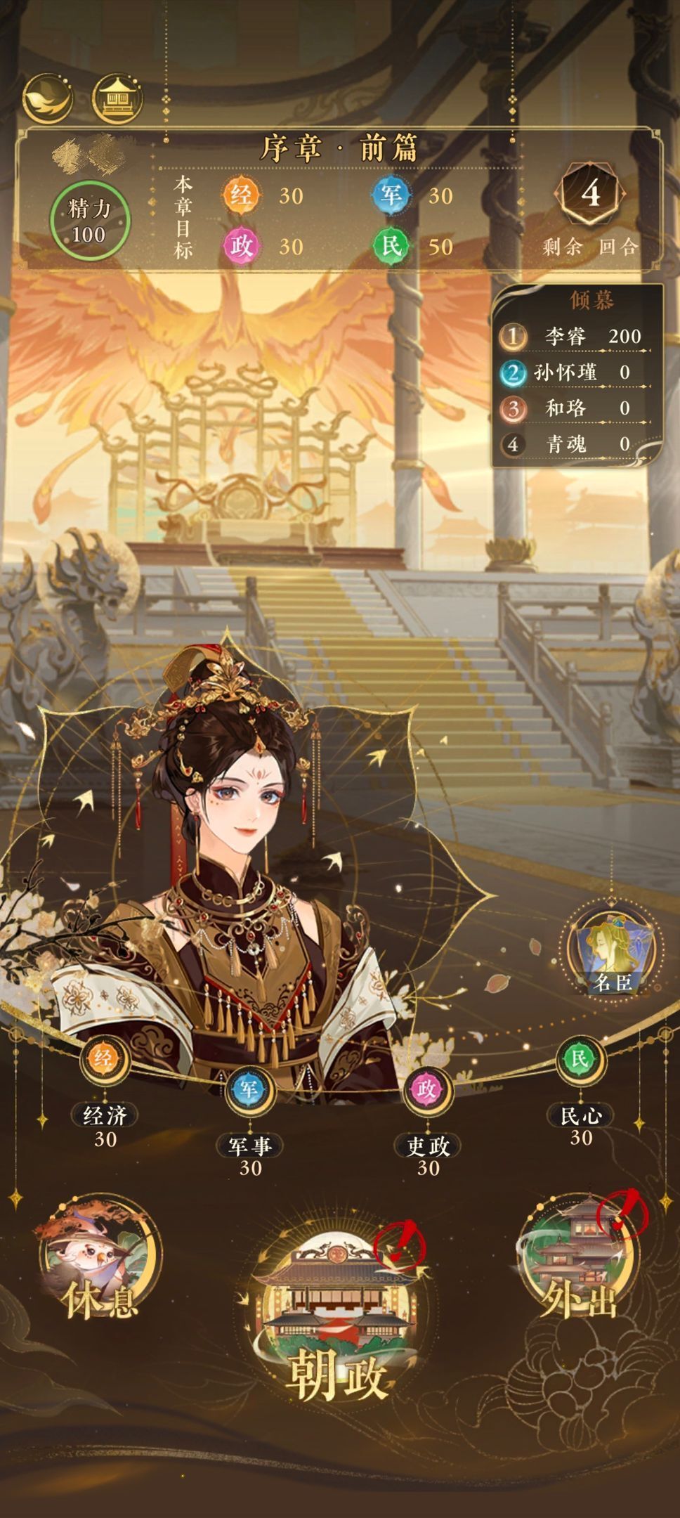 前期无法通过考验的公主们无需着急,前两盘通过【朝政】与【外出】邂逅四位名士,并用【凰权印信】提升等级增加属性,满级(5级)后只要确保第四章·决战之前各属性达到【300】即可,因【休息】将消耗一个回合数,前期游玩中公主们可选择【外出】来恢复精力。