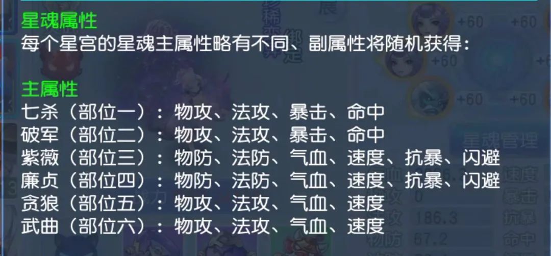 因为星魂的部位一和部位二是由物攻,法攻,暴击,命中组成,在这两个位置上,我们一定要追求主属性法攻+生存属性的星魂。这样在双方基础的叠加下,双生的技能效果发挥的淋漓尽致。