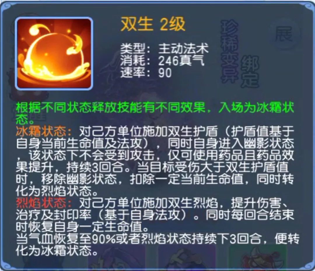 思瑶,具有独特的双生技能。它是一个“进可守退可攻”的宠物,之所以这么说,主要是因为这只宠物的守护效果要远远大于它的攻击效果。(这里指的攻击效果是附加状态)