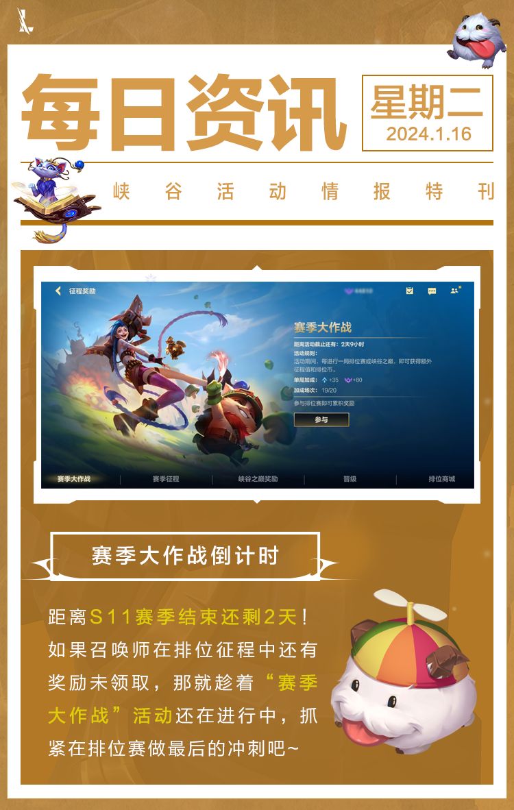 距离S11赛季结束还有2天!如果排位征程中还有奖励未领取,那就趁着“赛季大作战”活动开启时冲击奖励吧~全新S12赛季将在1月19日上午8:00开启,龙冕先锋 赵信等着大家前来开启新一轮征程~