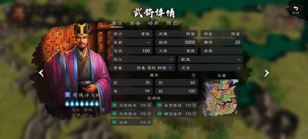 然后就是荀彧,看完他技能我只能说是华佗在世,俩个范围奶加一个单体奶,配合上防御极高的虎卫,往虎牢关一杵,能给何进折磨的连夜扛着火车离开长安。