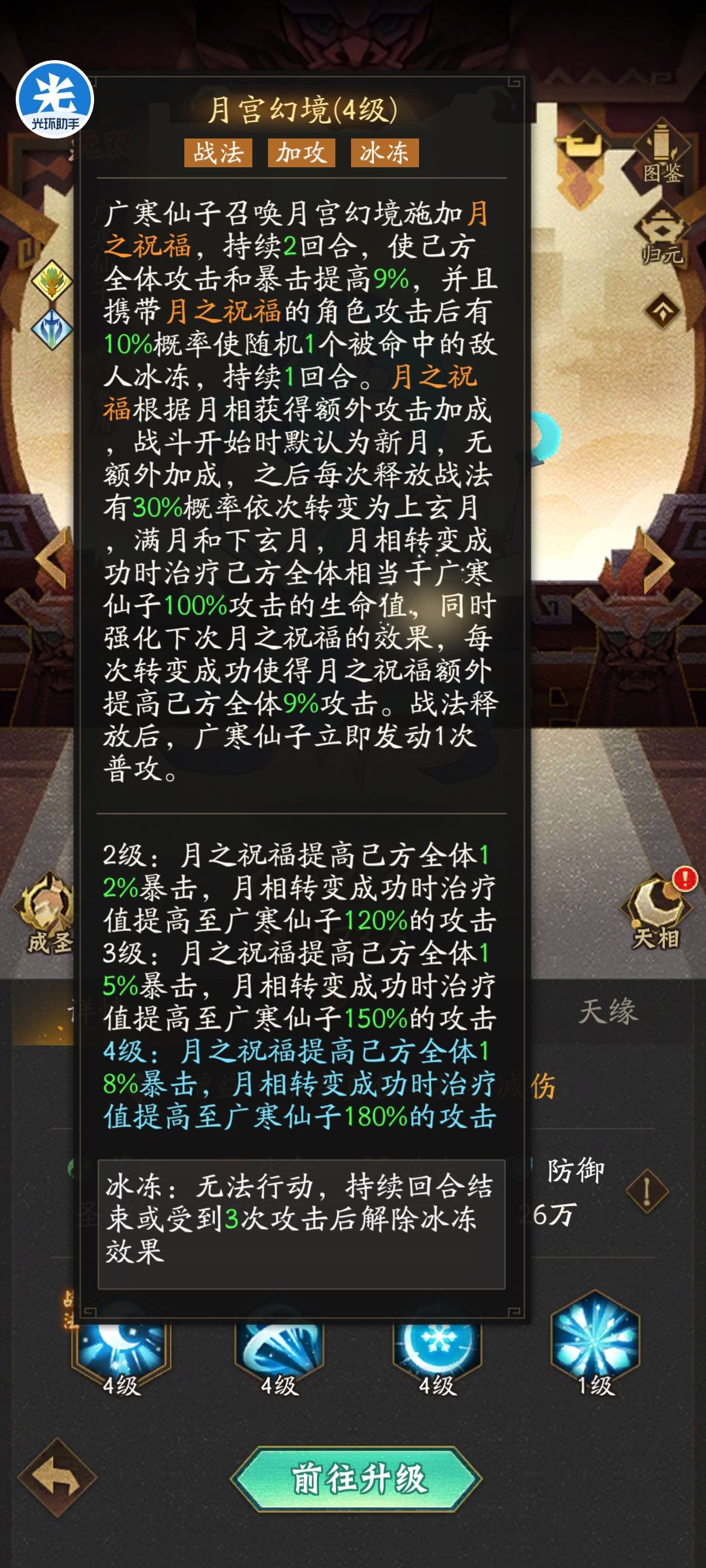 月相最多成功切换3次,到达下弦月🌗以后,后续战法不管是否成功切换月相,月相都是下弦月🌗,不会继续切换了。意思是达到下弦月后,全体队友的攻击都附加25%的冰冻概率。美中不足的是,不会再产生全体回血和额外增加攻击力。不过正常PvP,广寒成功切换3次月相时,已经差不多快打完了,影响不大。