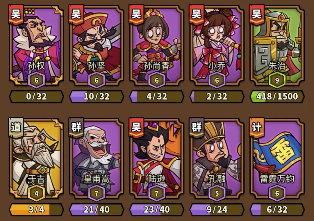 ①开局卡组:孙权、孔融、孙尚香、孙坚、小乔、朱治(全部满星)