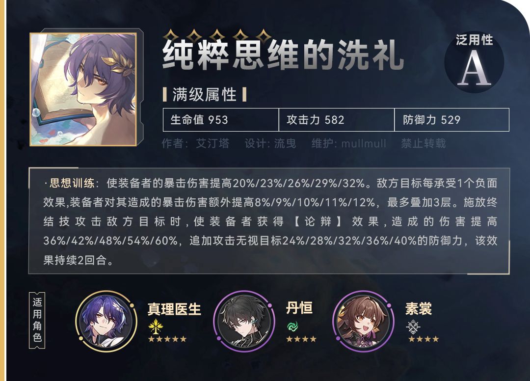 我们单独来看一下这张非常炸裂的,数值超高的光锥【纯粹思维的洗礼】。44%的暴伤,搭配虚无队友很容易吃满。而常驻的【如泥酣睡】只有30%暴伤,这么一对比,这专武的性价比还上去了。而且放终结技攻击敌人后还有增伤,持续两回合,比如泥酣睡不稳定的暴击率提升要好太多。