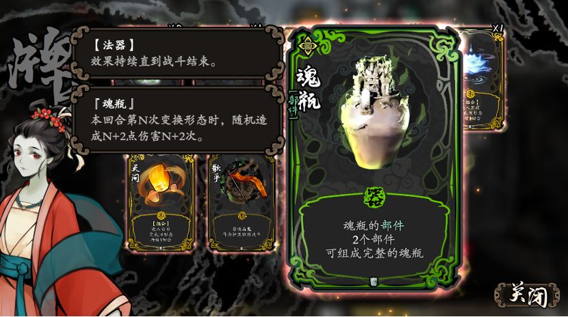 巫阳作为鬼职业的主角,使用的法器皆为陪葬品所化。巫阳可在某些条件下变换为“阴、阳、灵、魂、煞”形态,其作为“鬼”的存在恰可理解为脱离肉体的“灵魂”。因此,基于魂瓶与“灵魂”相关的概念,我们将法器魂瓶设计为与形态变换有关——灵魂暂居魂瓶之中,于是每一次形态的变换,都令魂瓶产生可造成伤害的能量。