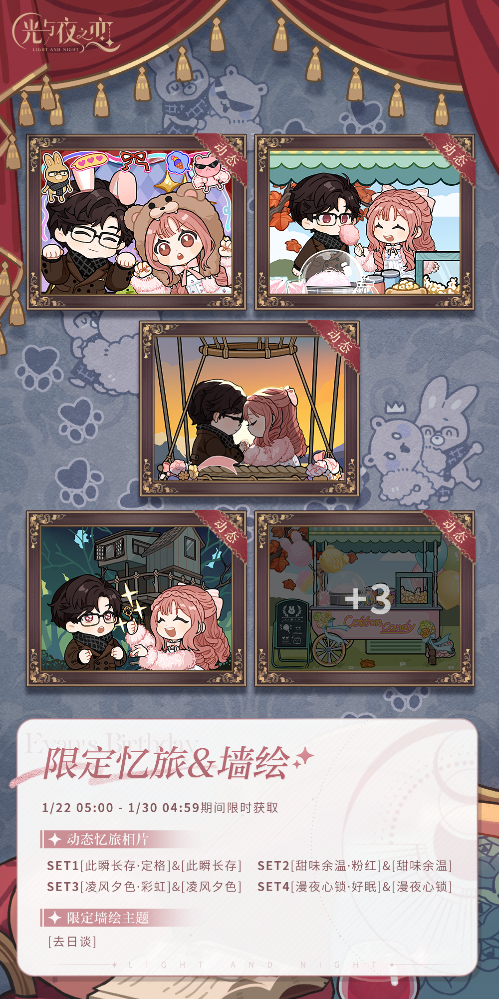 集齐陆沉生日系列四组动态忆旅相片后,可在限时计划处领取限定墙绘[去日谈]。