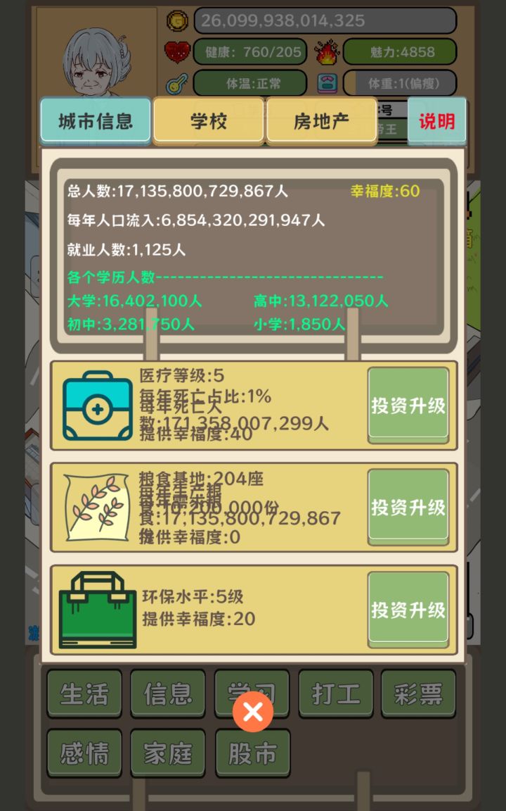 开局…………打开游戏先不要开局,先去把天赋富家子弟弄到1级(看俩广告+20技能点去升级一次富家子弟),然后开局,看七次奖励箱的广告,弄好生活页面后,然后去4S店买最便宜的车跑滴滴攒钱,攒到自己认为合适的数(最好一百万以上)就去无脑买卖,一直无脑买卖至几千亿的时候(记得顺便多买寿命药),再去学习页面把学历弄到大学,把教育和建筑学分弄到三百后,就可以去建设学校了,然后建设五百所学校,教育水平拉满(十级),然后依靠吃寿命药+疯狂下一年,你也可以做到