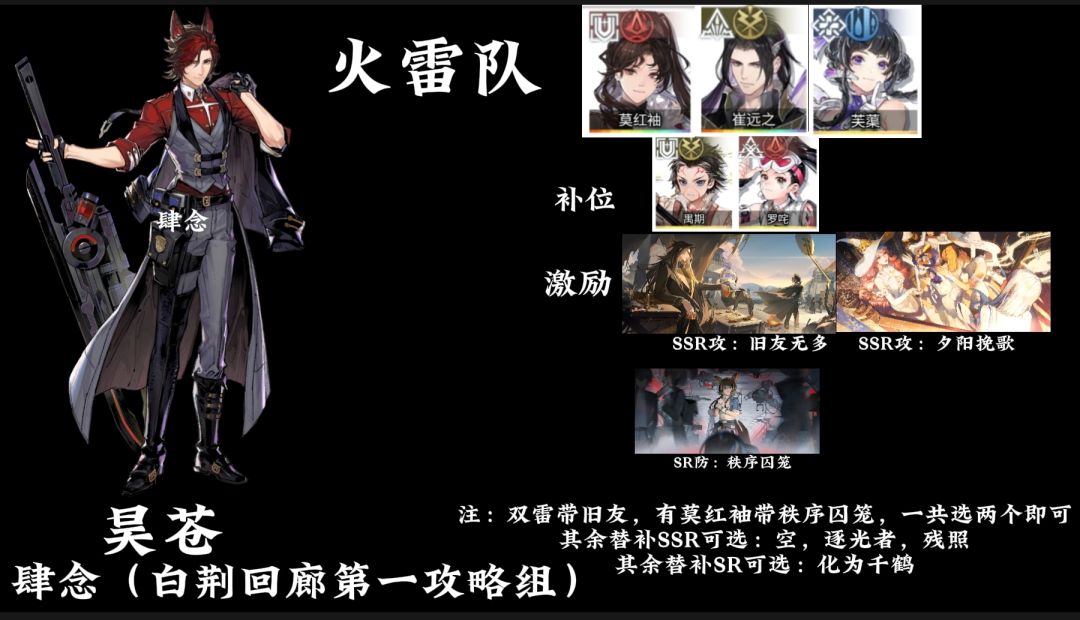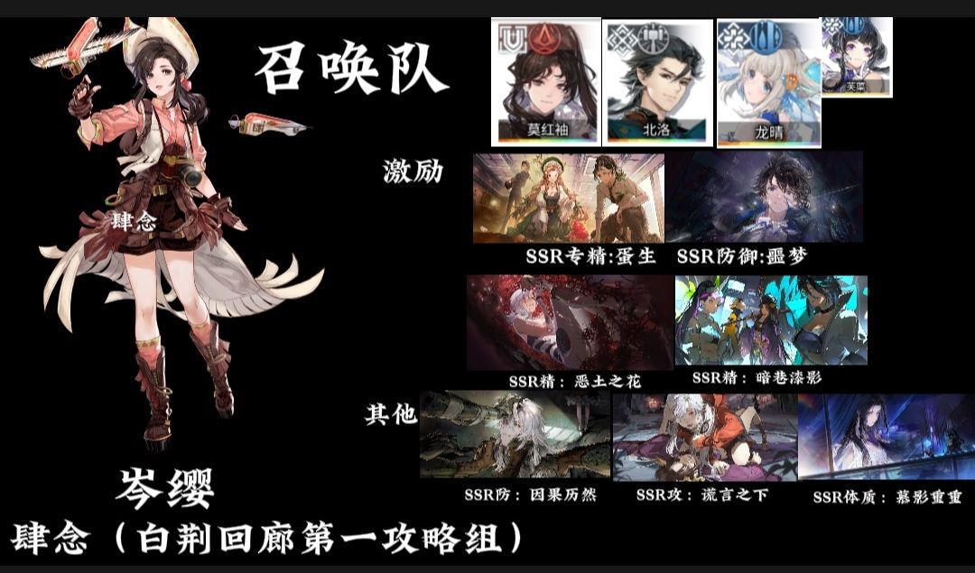召唤队:岑缨做队长,主线送的SSR(慕影重重/因果历然/谎言之下)召唤队很好用。带龙晴可以再带一张噩梦,还可以带一张蛋生,这样就可以凑齐20层激励。其他的也可以用恶土/暗巷替换(这里主要考虑到少用资源抽烙痕)