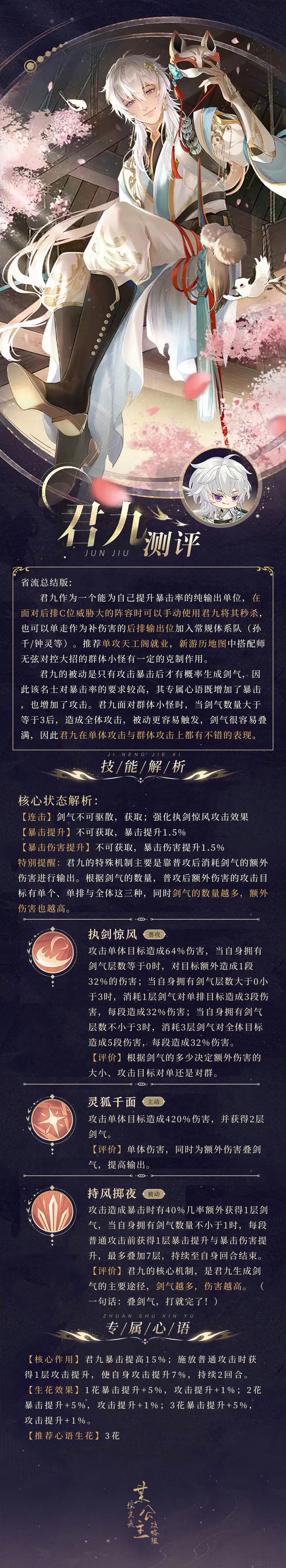 核心作用:君九暴击提高15%;施放普通攻击时获得1层攻击提升,使自身攻击提升7%,持续2回合。