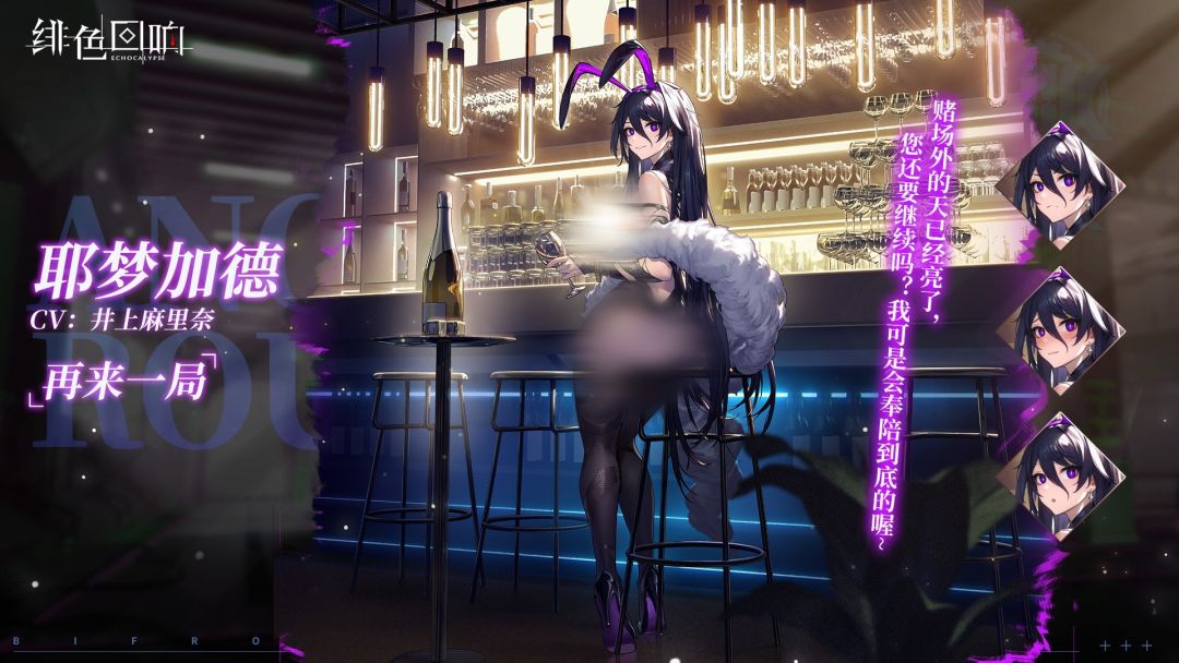 夜幕降临,灯光闪烁,卡牌声与谈笑声交织。一位身着兔女郎服装的美少女婀娜多姿地站在吧台前,迷人而神秘。美少女的目光在人群中游走,突然间,她回首一笑,那笑容仿佛蕴含了整个夜晚的诱惑,让人不禁为之心动。“赌场外的天已经亮了,您的赌局还要继续吗?我可是会奉陪到底喔~”