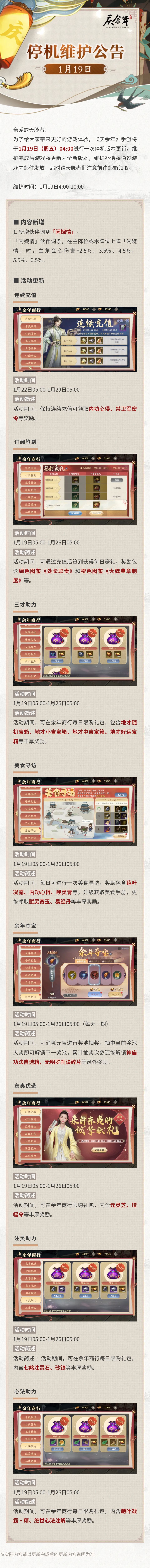 为了给大家带来更好的游戏体验,《庆余年》手游将于1月19日(周五)04:00进行一次停机版本更新,维护完成后游戏将更新为全新版本,维护补偿将通过游戏内邮件发放,届时请天脉者们注意前往邮箱领取。