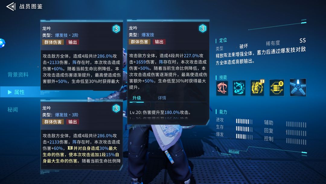 在所有12个SS级的破环型战员中,有6个战员的技能是3-4段伤害的,那么暴击率的提高可以通过多段伤害来打出更大的期望伤害。而且很多其他非破坏型战员,例如诺姆·死火余烬,牧歌·末日猎手,他们的战技也都是多段的,这些都能把苍龙的阵法暴击增益最大化。