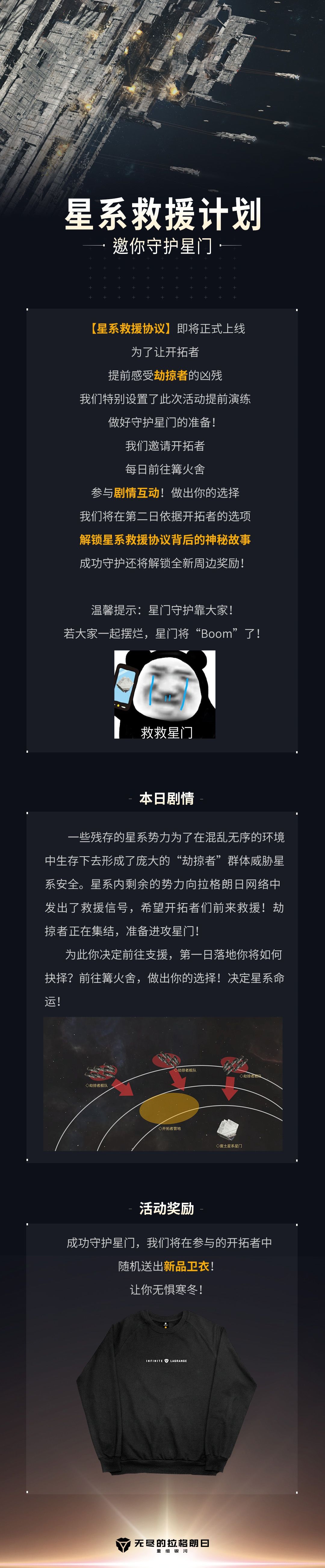 每日参与剧情互动!做出你的选择,我们将在第二日依据开拓者的选项解锁新的剧情。一起救援星系,保卫星门!你就是星系的守护者!成功守护还将解锁全新周边奖励!开拓者们速来参与!