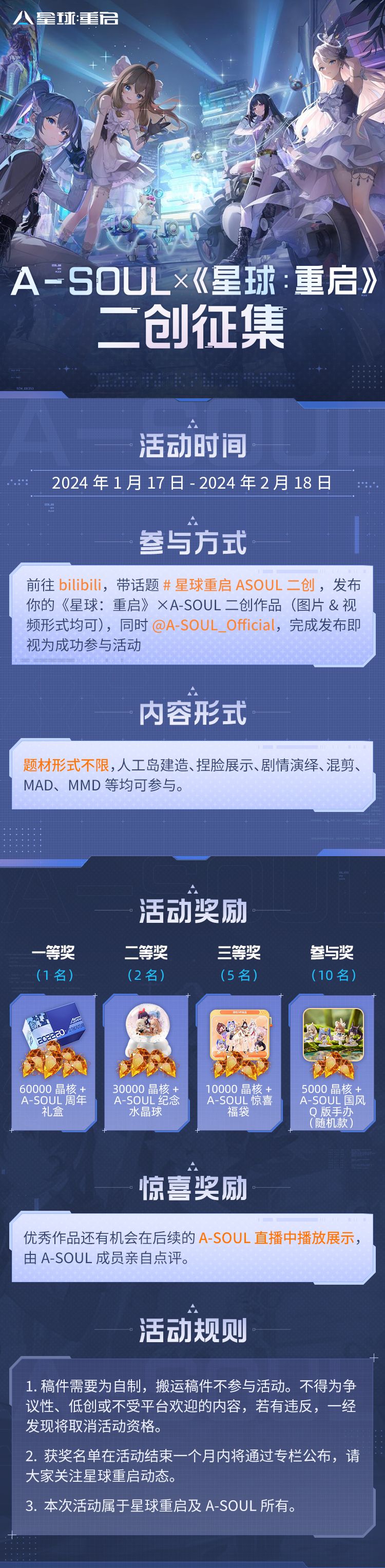 ☆参与方式:创作与《星球:重启》×A-SOUL联动相关的作品,带话题#星球重启ASOUL二创 在bilibili平台发布并@A-SOUL_Official