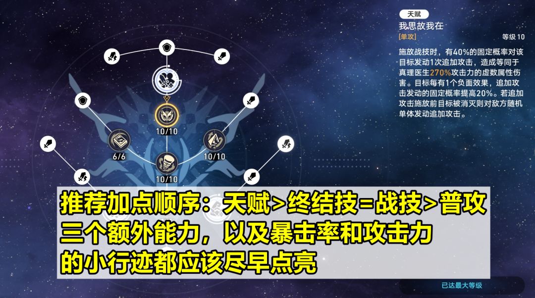 推荐技能升级顺序为:天赋>终结技=战技>普攻。天赋对应着真理医生最重要的伤害来源:追加攻击,自然要优先升级。终结技和战技的主要作用都是触发追加攻击,两者的总伤害占比其实差不多,所以放在天赋之后再升级。行迹方面,三个额外能力都很重要,小行迹的攻击力和暴击率也推荐尽早点亮。