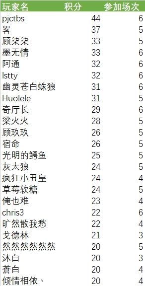 各位玩家好,非常感谢大家的参与和支持。恭喜以下玩家获得本次比赛的奖品,他们的积分分别为:【pjctbs】 44分、【畧】 37分、【顾柒柒】 33分、【墨无情】 33分、【阿通】 32分、【lstty】 32分、【幽灵苍白蛛狼】 31分、【Huolele】 31分、【奇厅长】 29分、【梁火火】 28分、【顾玖玖】 26分、【宿命】 26分、【光明的鳄鱼】 25分、【灰太狼】 24分、【疯狂小丑皇】 24分、【草莓软糖】 24分、【俺也难】 23分、【chris3】 22分、【旷然散我愁】 22分、【戈德林】 21分、【然然然然然然】 20分、【沐白】 20分、【蒼白】 20分、【倾情相依丶】 20分