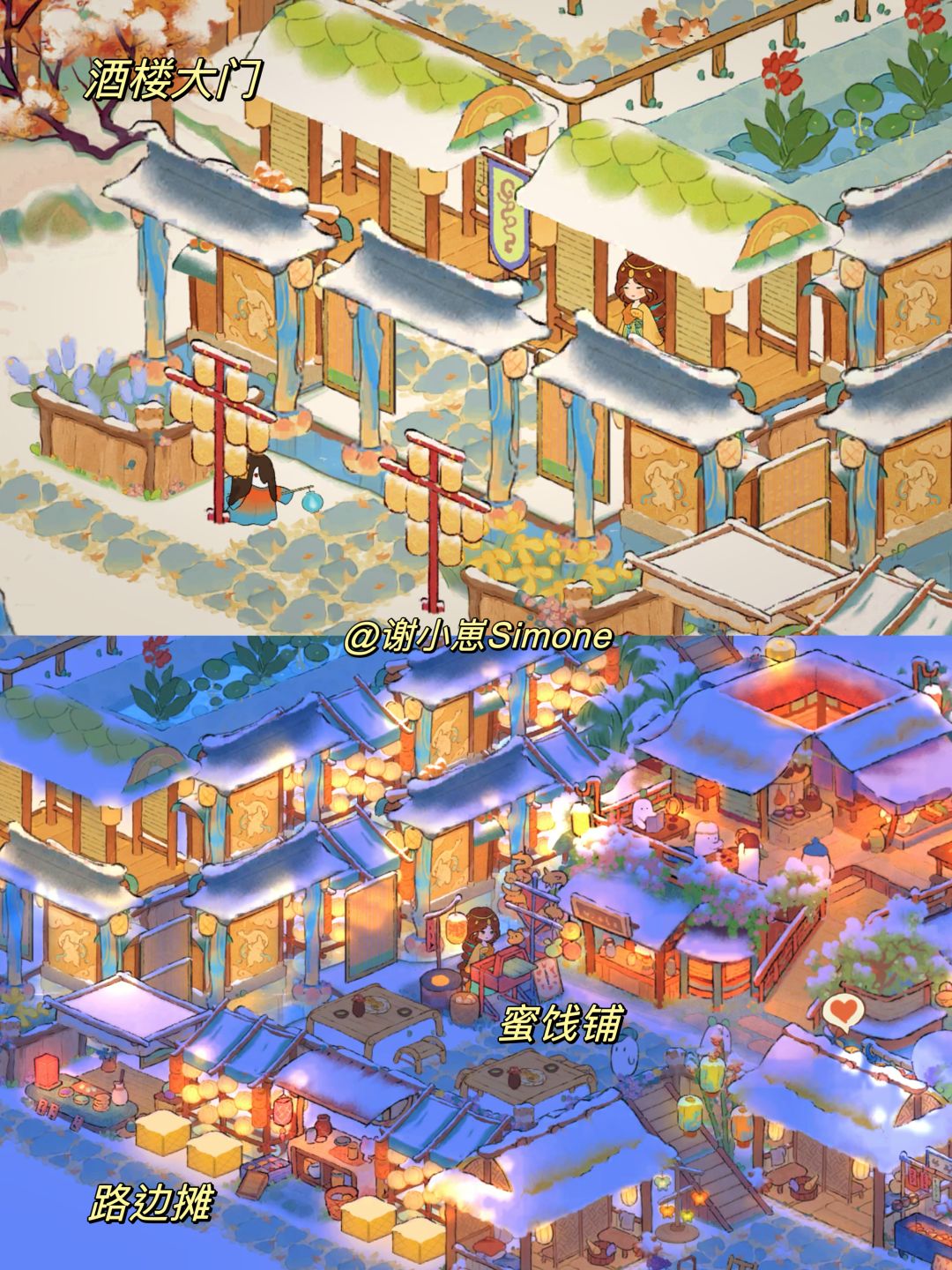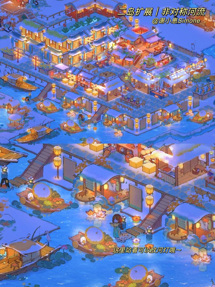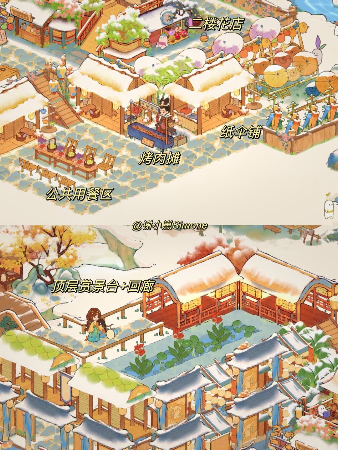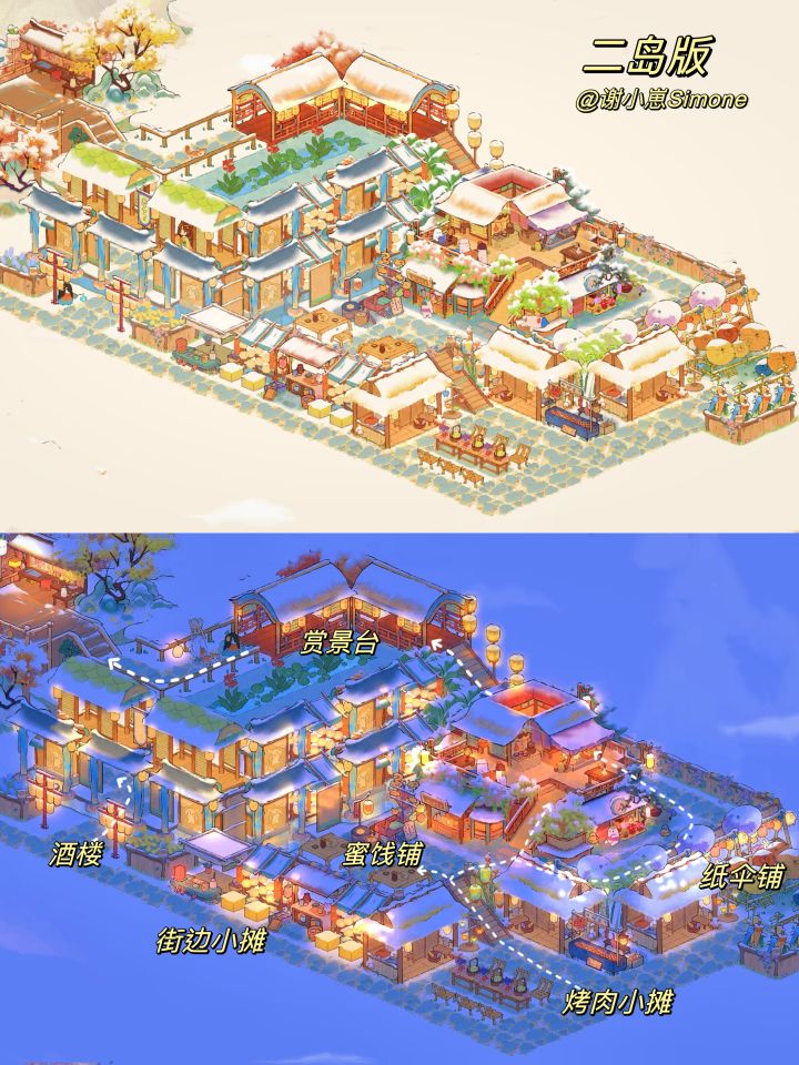 自汴京樊楼、敦煌石窟后,新的地标系列「洪崖洞篇」来啦,不能一比一复刻,只能说现实建筑带来了一些灵感,并在桃源里实现~~这次主要是用了桃源乡的奢侈建筑「烟萝朝市」和一些「市集小物件」,功能区有酒楼、纸伞铺、烤肉摊、蜜饯铺等等,充满烟火气息又很豪华的布局。
