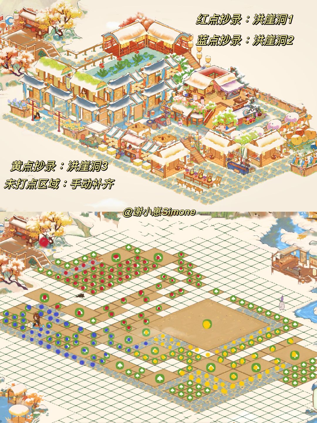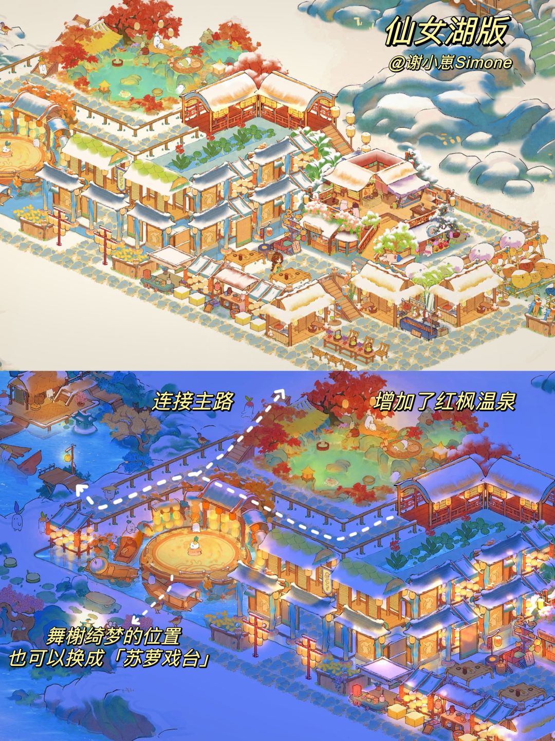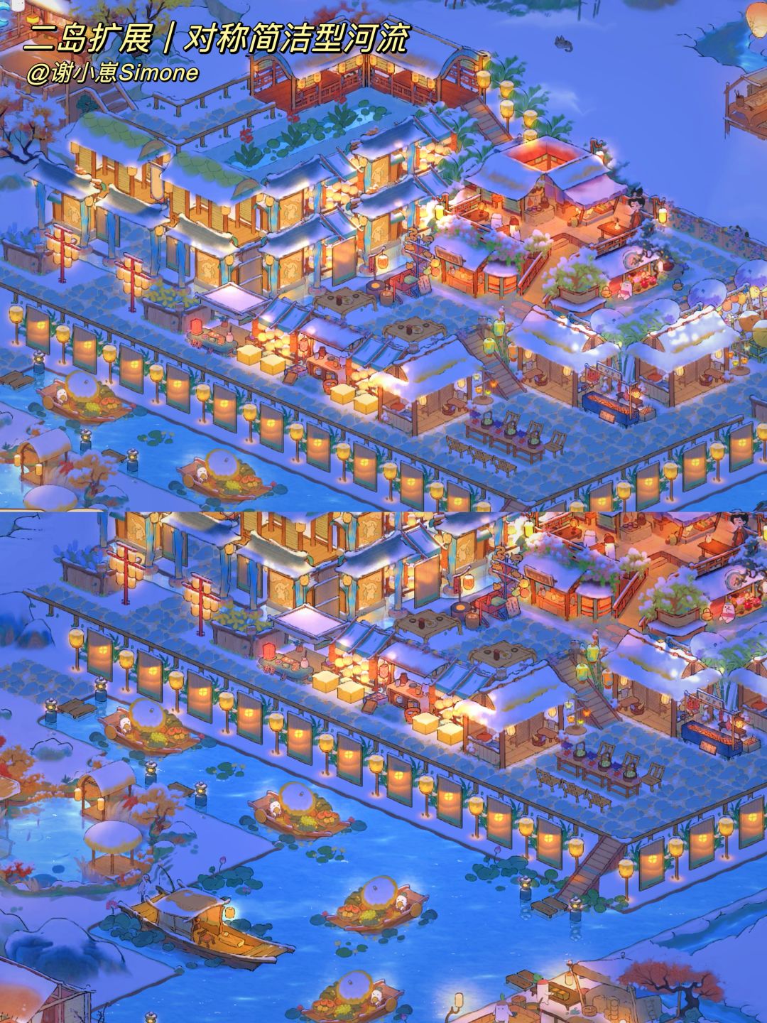 自汴京樊楼、敦煌石窟后,新的地标系列「洪崖洞篇」来啦,不能一比一复刻,只能说现实建筑带来了一些灵感,并在桃源里实现~~这次主要是用了桃源乡的奢侈建筑「烟萝朝市」和一些「市集小物件」,功能区有酒楼、纸伞铺、烤肉摊、蜜饯铺等等,充满烟火气息又很豪华的布局。