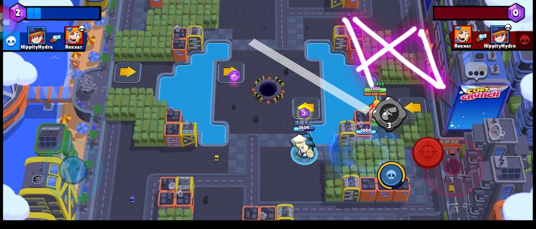 ③有超级技能后将右上方的草丛和掩体一并炸掉,因为上方的草丛很容易有英雄躲藏,会影响公主的正常输出,同时,右上方的掩体也会阻挡公主的攻击。