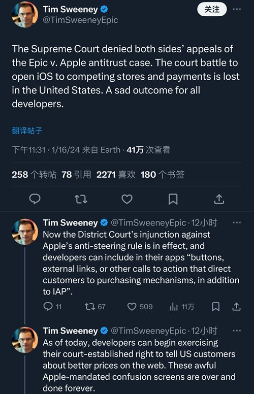 Epic创始人、CEO Tim Sweeney在获悉最高法裁决后表示,很遗憾在美国境内实现iOS内竞争应用商店和支付渠道的想法失败,对所有开发者都不是好结果。