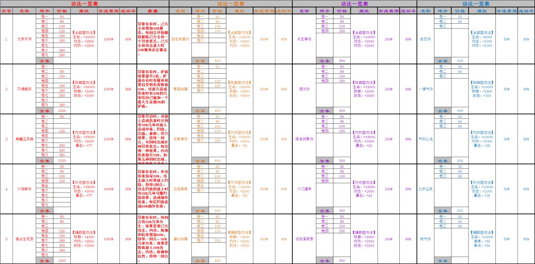 功法一览表: