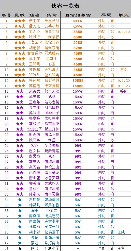 侠客价格如下: