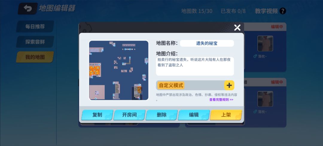 OK,本帖故事介绍完毕,其实我更想将这些故事的具体文字融入这张地图中,但因为字数限制,我只能将主要内容放进去。虽不完美,但不完美亦是完美。感谢各位耐心的看完本帖。希望你们可以前往奇葩的地图编辑器去体检体验我的这张图——