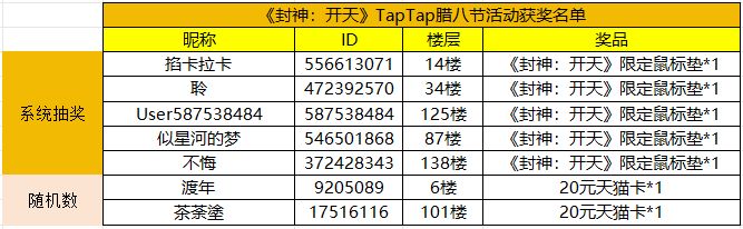 恭喜以上将军大人获奖,还请名单内的将军大人在开奖后的12个工作日内即2月19号之前,加入《封神:开天》玩家交流群:860840777,并私聊噗噗酱等客服提供tap账号截图信息核对和登记奖品寄送信息。