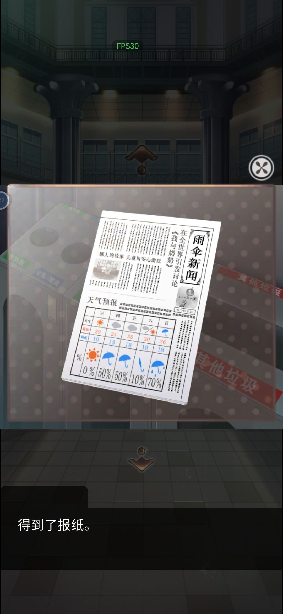 2.至站外左转,点击垃圾桶,获得报纸,得知对应图案