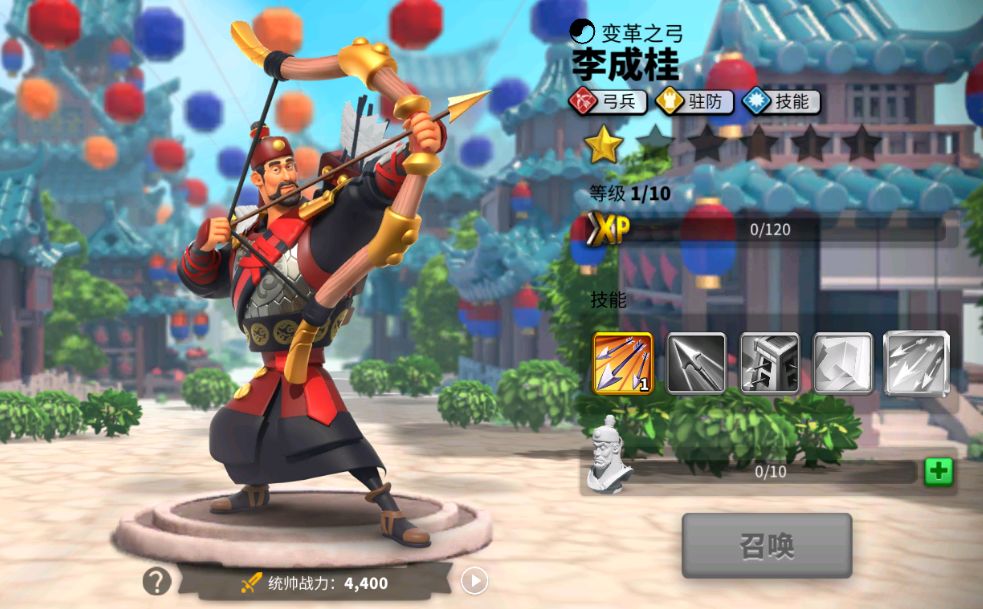 技能3,阿蒙军团:纯弓时,技能减伤30%,被打10%概率攻+40%,速度+40%,持续3秒。