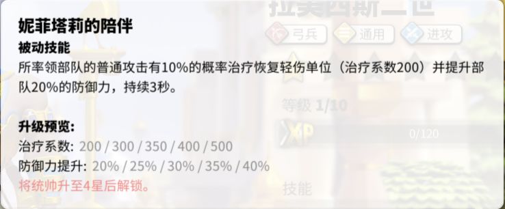 技能4,妮菲塔莉的陪伴:普攻10%概率回血500,防+40%,持续3秒。