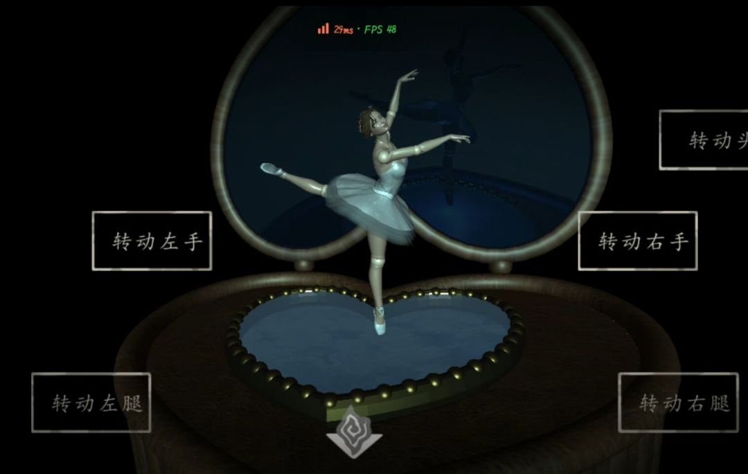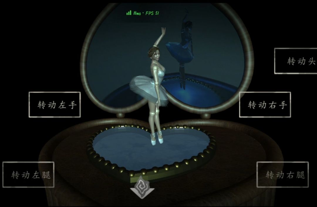 调查旁边抽屉提示锁住了,退出来后拿走卧室脸盆架上获得洗脸盆,退到客厅调查电视显示没找到旋钮,退出来调查右边房间进入卫生间,卫生间浴缸里都是血水所以用刚刚拿到的脸盆将水舀出来,里面露出八音盒,这里需要调整小人偶的动作和镜子中一样,注意人偶是镜像的,所以左右要对调一下,一共要调整三次,依次是如下图动作。