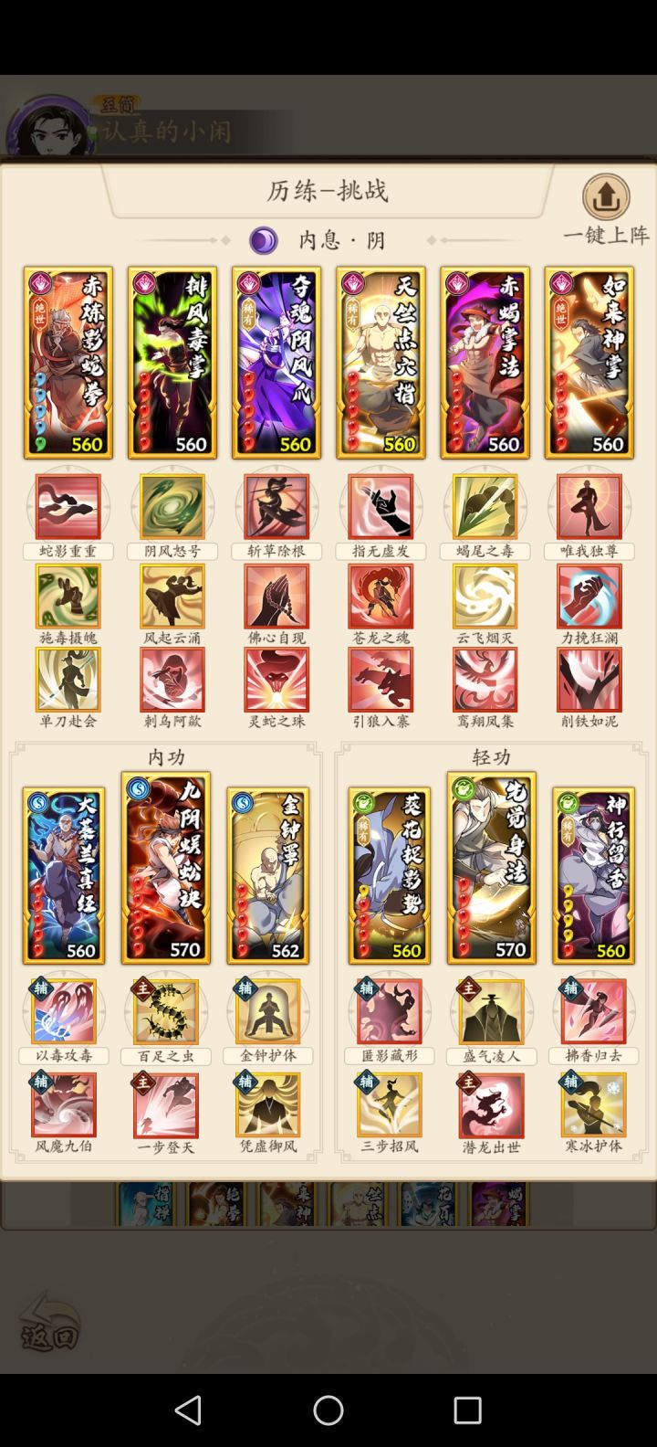 现在说我这套配招,基础条件也是最优追攻击(包括淬锋,主先觉,更多的勇猛和中级勇猛),装备有条件的尽量搞更多的高调(预计往后很长的一段时间高调都可能是阴拳最好的装备),主潜龙和主御风可以自由调整不影响大局,伤害点在于灵蛇之珠和蛇拳触发的如来入魔,最乐观的情况下如来一张牌可以秒同战任何系满血,因为赤蝎带出来的dot会受到入魔加成非常痛而且不会被混乱,当然实战中千变万化,第6手不可能每把都完美触发,会被盲目心惊弄的很难受,总结就是这套天花板输出,视觉效果很爆炸,但是爆发怕被控。(追求更极端的伤害可以把苍龙之魂换飞沙走石)