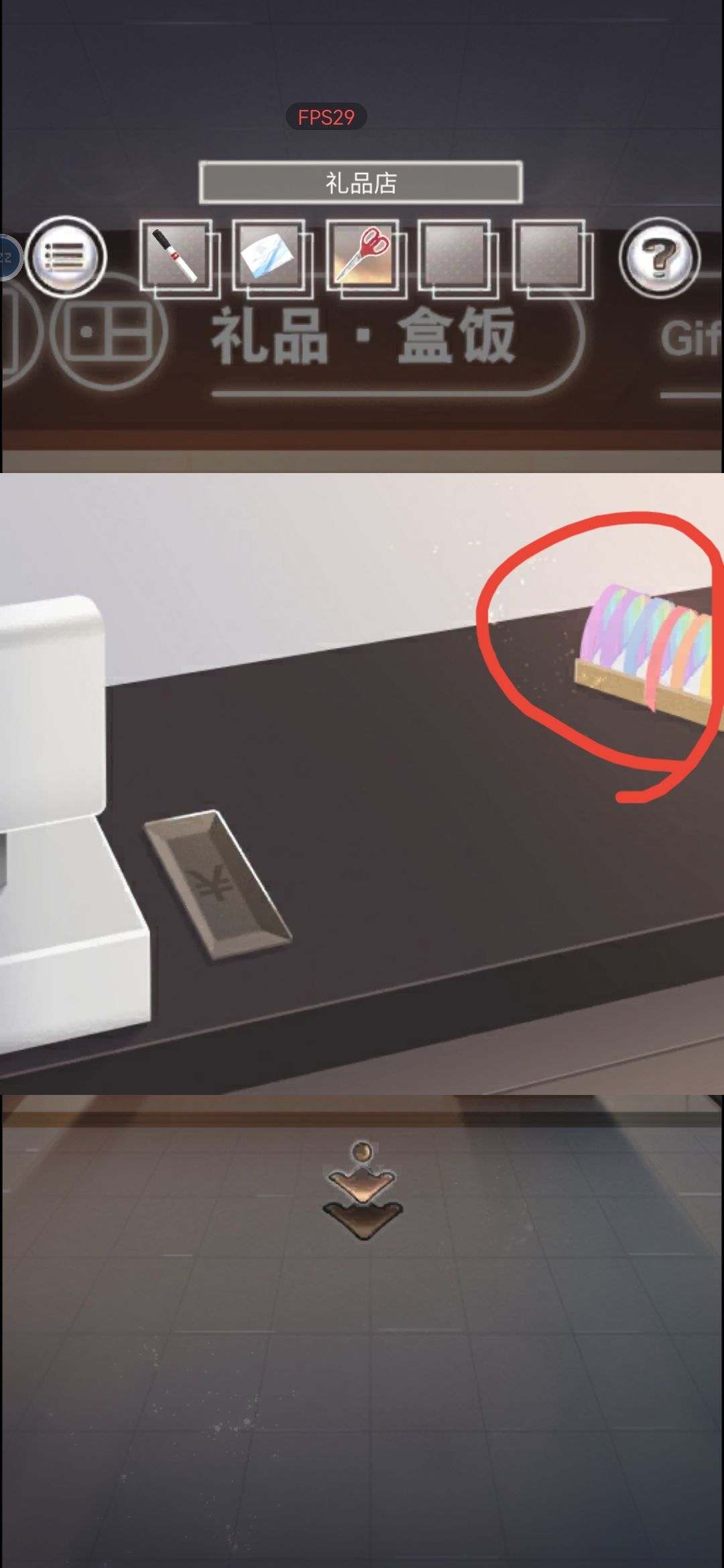2.去礼品店点击右边的纸盒拿到笔,再点击收银台,用剪刀剪缎带