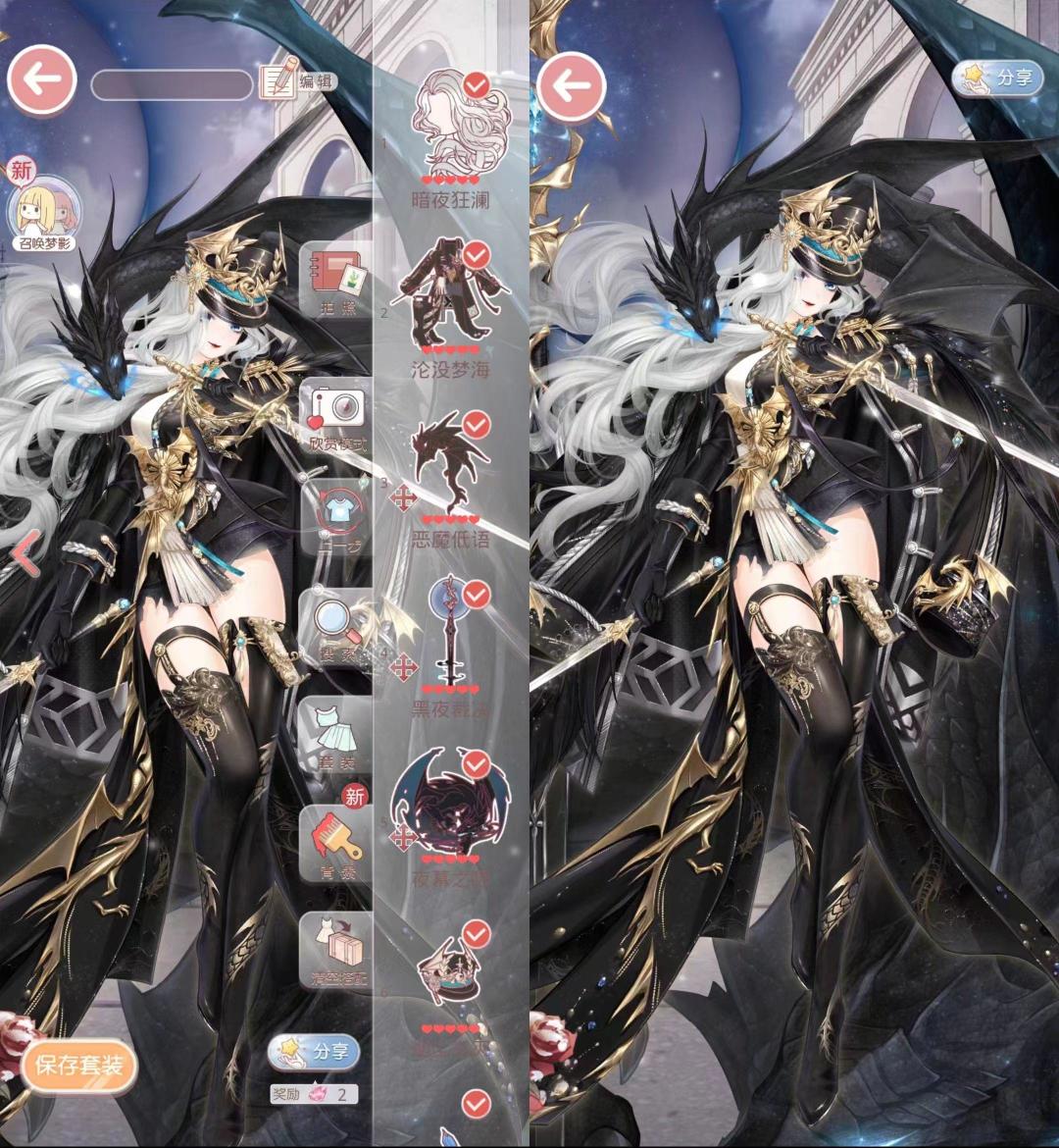 从右侧已有服饰中,选取你喜欢的或是你认为合适的衣服、首饰等进行搭配,完成之后可以在【欣赏模式】中,进行移动调整等操作,然后将自由搭配好的套装分享或保存下来。