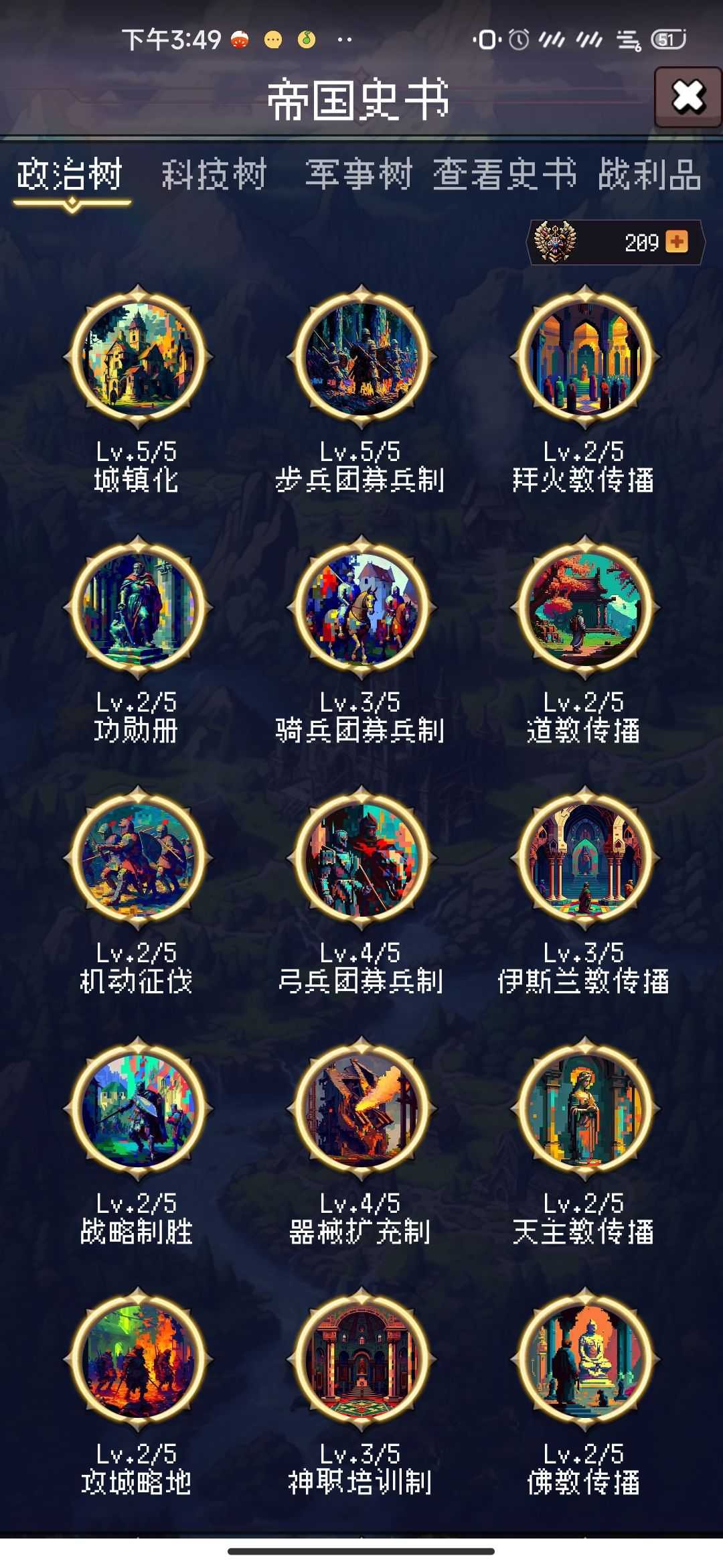 政治树:第一列⭐城镇化必加满,其他二级加到游击战略即可
