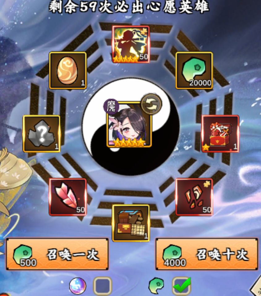 每次会在心愿试炼中给10个许愿道具,剩下50抽可通过勾玉抽取,一共需要20000勾玉