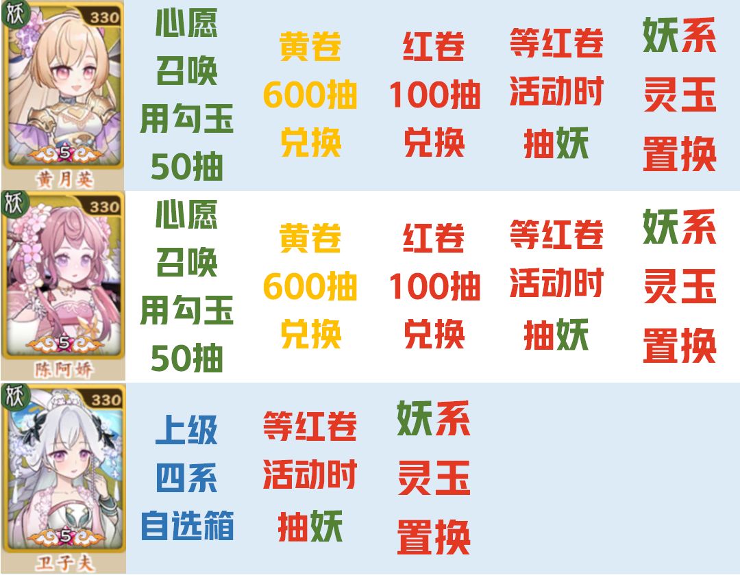 妖系推荐角色的获取方式:
