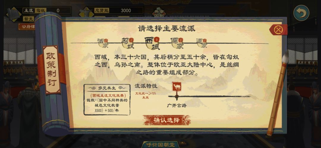 多元共生:(西域主流文化效果)钱数+(国中不同种类的城邑文化数量X500)+500/年